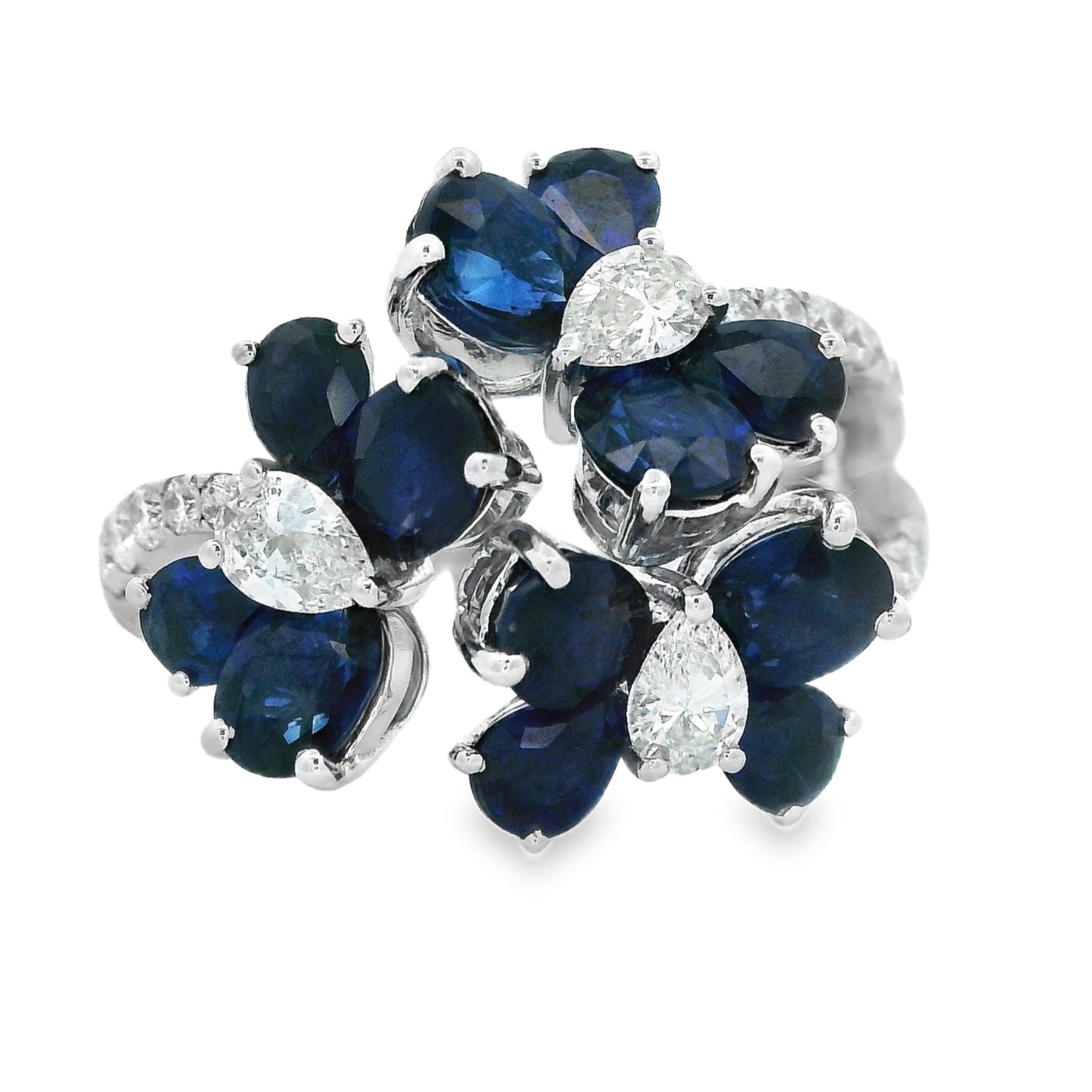 Lady's White 14 Karat Polish Split Band Radiant Butterfly Fashion Ring Size 6.25 12=3.43tw Oval and Pear Blue Sapphires 3=0.27tw Pear G/H SI1 Diamonds 19=0.28tw Round G/H SI1 Diamonds