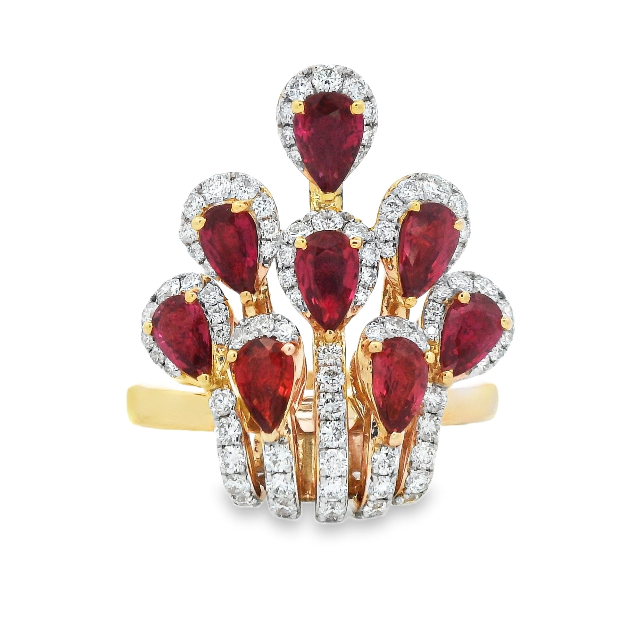 Lady's Yellow 14 Karat Polish Radiant Fashion Ring Size 6.5 8=1.94tw Pear Rubys 96=0.77tw Round G/H SI1 Diamonds