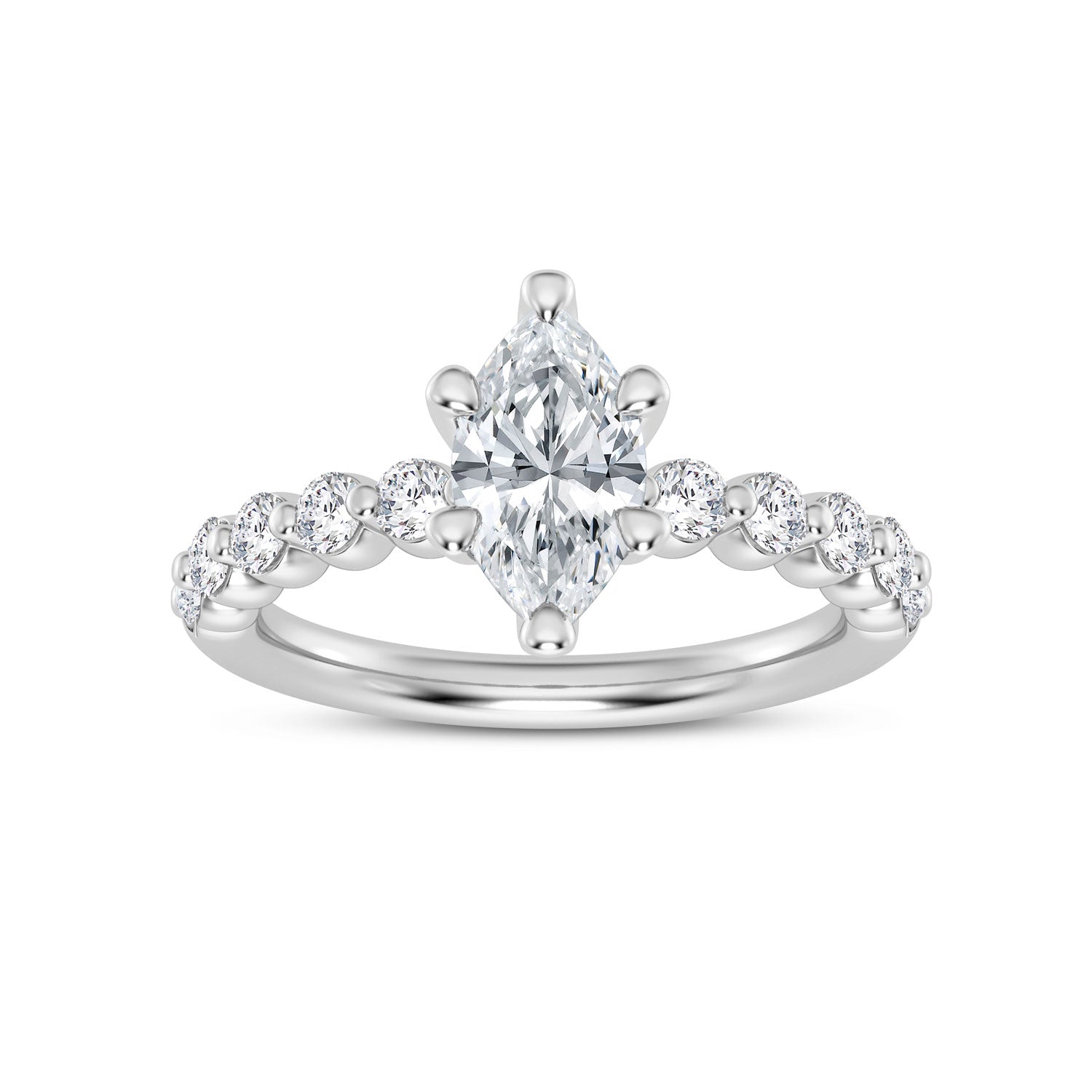 Lady's Polish Ring With 16=0.37Tw Round G/H Vs1 Diamonds And 48=0.18Tw Round G/H Vs1 Diamonds Head Style: Diamond Crown Head Size: 1.50 Carat Head Head Shape: Marquise Head Metal: 14 Karat Metal Color: White Shank Collection: Beloved Shank Size: T