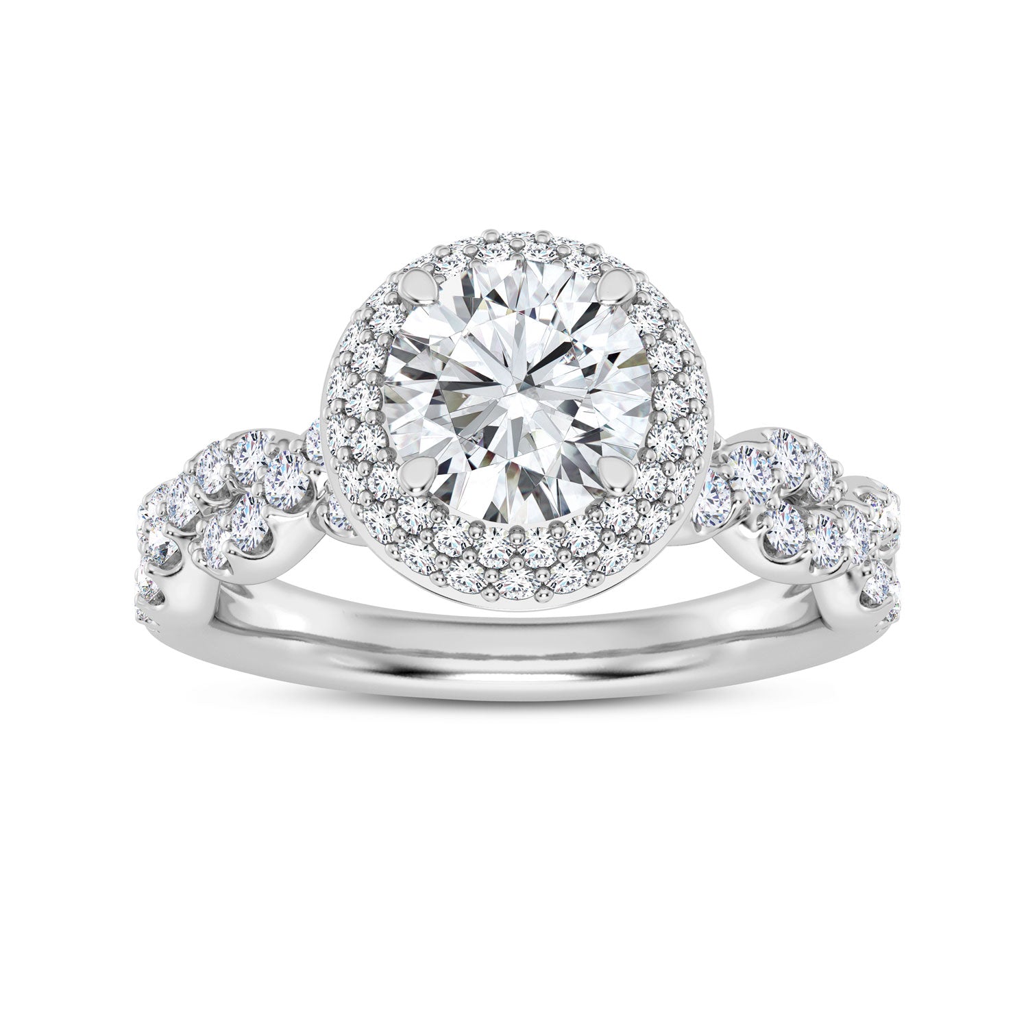 Lady's Polish Ring 36=0.44tw Round G/H VS1 Diamonds 44=0.40tw Round G/H VS1 Diamonds Head Style: Waterfall Diamond Halo Head Size: 1.50 Carat Head Head Shape: Round Head Metal: 14 Karat Metal Color: White Shank Collection: Embrace Shank Size: Tradi