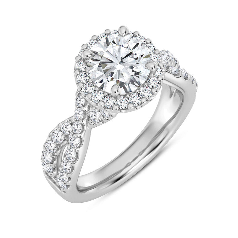 Lady's Polish Ring 18=0.18tw Round G/H VS1 Diamonds 38=0.57tw Round G/H VS1 Diamonds Head Style: Diamond Halo Head Size: 1.50 Carat Head Head Shape: Round Head Metal: 14 Karat Metal Color: White Shank Collection: Starcrossed Shank Size: Traditional