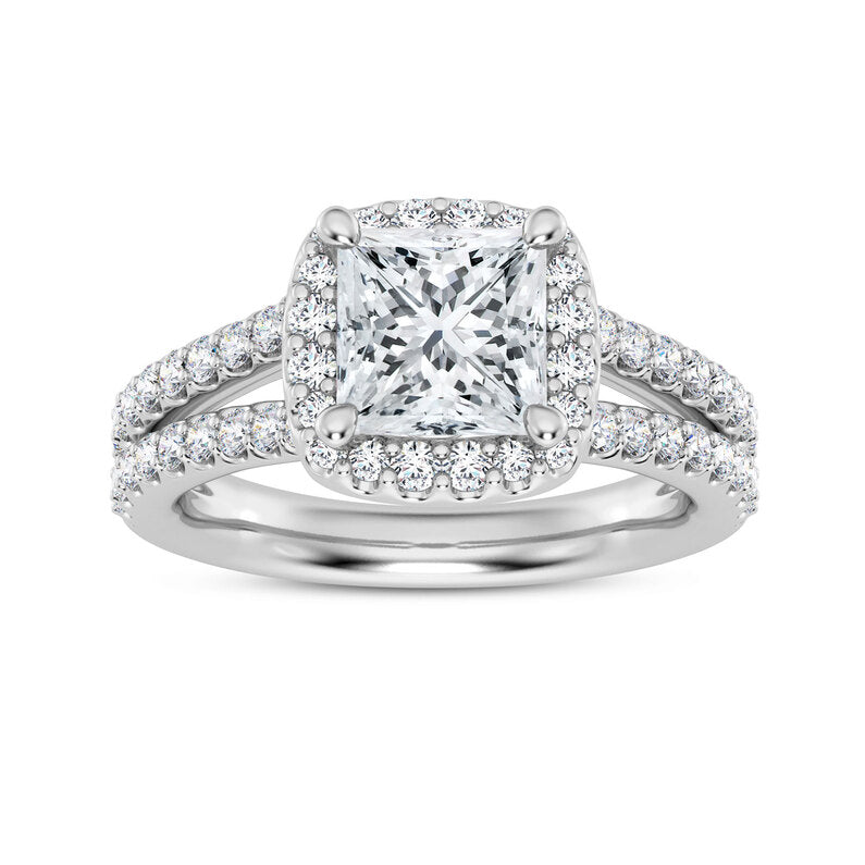 Lady's Polish Ring 42=0.23tw Round G/H VS1 Diamonds 20=0.19tw Round G/H VS1 Diamonds Head Style: Diamond Cushion Halo Head Size: 1.50 Carat Head Head Shape: Princess Head Metal: 14 Karat Metal Color: White Shank Collection: Te Amo Shank Size: Tradi