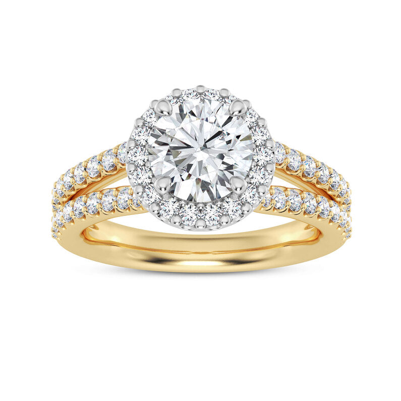 Lady's Polish Ring 42=0.23tw Round G/H VS1 Diamonds 18=0.18tw Round G/H VS1 Diamonds Head Style: Diamond Halo Head Size: 1.50 Carat Head Head Shape: Round Head Metal: 14 Karat Metal Color: Two-Tone Shank Collection: Te Amo Shank Size: Traditional R