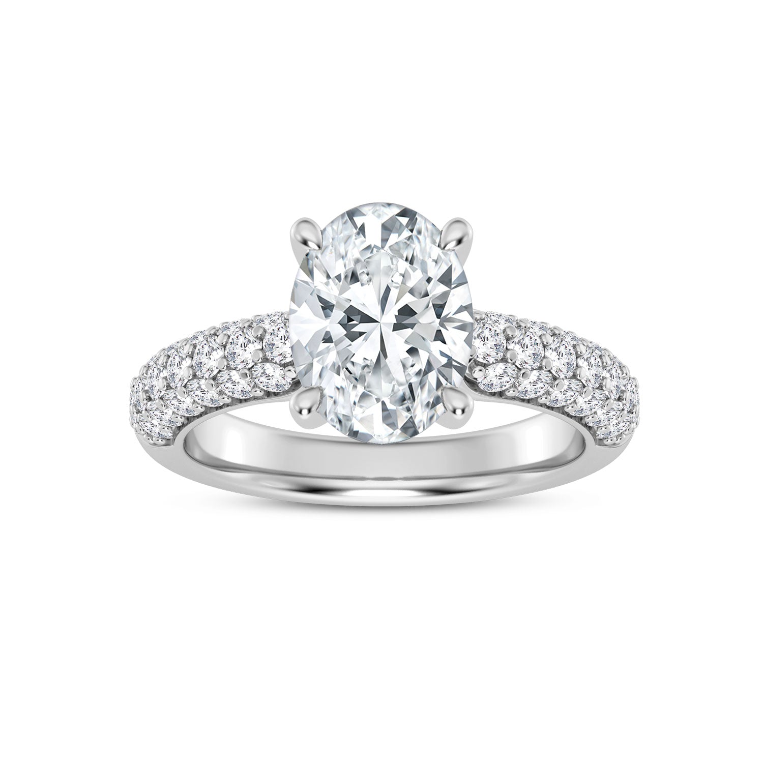 Lady's Ring 38=0.82tw Round G/H SI1 Diamonds 28=0.12tw Round G/H VS1 Diamonds 44=0.71tw Round G/H SI2 Diamonds Head Style: Diamond Hidden Halo Head Size: 2.00 Carat Head Head Shape: Oval Head Metal: 14 Karat Metal Color: White Shank Collection: Voy