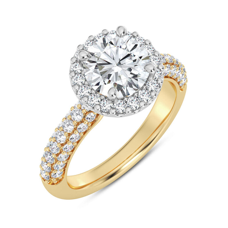 Lady's Polish Ring 18=0.18tw Round G/H VS1 Diamonds 50=0.50tw Round G/H VS1 Diamonds Head Style: Diamond Halo Head Size: 1.50 Carat Head Head Shape: Round Head Metal: 14 Karat Metal Color: Two-Tone Shank Collection: Voyage Shank Size: Traditional R
