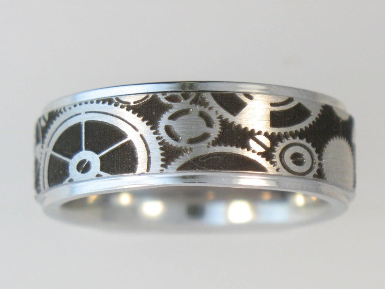 Ring Size 10.25 Style: Modern Metal: Serinium Gears Color: White Finish: Engraved Location: 504 Sz 11.5